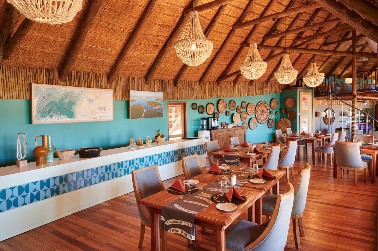 - Open-plan lounge, bar, dining areas, and boma with Delta views